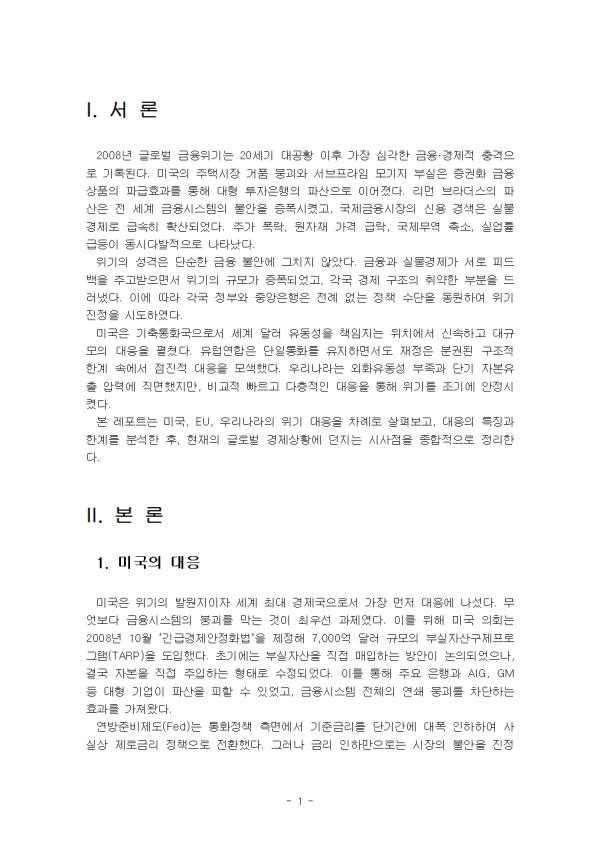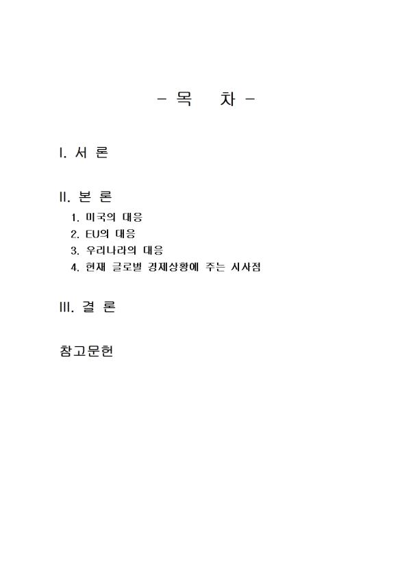 II. º» ·Ð 1. ¹Ì±¹ÀÇ ´ëÀÀ 2. EUÀÇ ´ëÀÀ 3. ¿ì¸®³ª¶óÀÇ ´ëÀÀ 4. ÇöÀç ±Û·Î¹ú °æÁ¦»óȲ¿¡ ÁÖ´Â ½Ã»çÁ¡