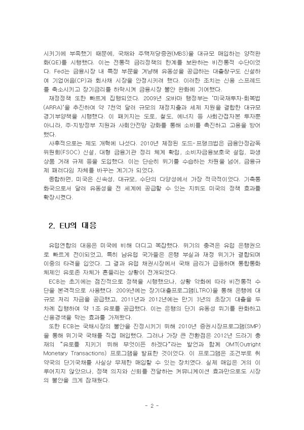 ¹Ì±¹Àº À§±âÀÇ ¹ß¿øÁöÀÌÀÚ ¼¼°è ÃÖ´ë °æÁ¦±¹À¸·Î¼ °¡Àå ¸ÕÀú ´ëÀÀ¿¡ ³ª¼¹´Ù. ¹«¾ùº¸´Ù ±ÝÀ¶½Ã½ºÅÛÀÇ ºØ±«¸¦ ¸·´Â °ÍÀÌ ÃÖ¿ì¼± °úÁ¦¿´´Ù. À̸¦ À§ÇØ ¹Ì±¹ ÀÇȸ´Â 2008³â 10¿ù ¡®±ä±Þ°æÁ¦¾ÈÁ¤È¹ý¡¯À» Á¦Á¤ÇØ 7,000¾ï ´Þ·¯ ±Ô¸ðÀÇ ºÎ½ÇÀڻ걸Á¦ÇÁ·Î±×·¥(TARP)À» µµÀÔÇß´Ù. Ãʱ⿡´Â ºÎ½ÇÀÚ»êÀ» Á÷Á¢ ¸ÅÀÔÇÏ´Â ¹æ¾ÈÀÌ ³íÀǵǾúÀ¸³ª, °á±¹ ÀÚº»À» Á÷Á¢ ÁÖÀÔÇÏ´Â ÇüÅ·Π¼öÁ¤µÇ¾ú´Ù. À̸¦ ÅëÇØ ÁÖ¿ä ÀºÇà°ú AIG, GM µî ´ëÇü ±â¾÷ÀÌ ÆÄ»êÀ» ÇÇÇÒ ¼ö ÀÖ¾ú°í, ±ÝÀ¶½Ã½ºÅÛ ÀüüÀÇ ¿¬¼â ºØ±«¸¦ Â÷´ÜÇÏ´Â È¿°ú¸¦ °¡Á®¿Ô´Ù. ¿¬¹æÁغñÁ¦µµ(Fed)´Â ÅëÈÁ¤Ã¥ Ãø¸é¿¡¼ ±âÁرݸ®¸¦ ´Ü±â°£¿¡ ´ëÆø ÀÎÇÏÇÏ¿© »ç½Ç»ó Á¦·Î±Ý¸® Á¤Ã¥À¸·Î ÀüȯÇß´Ù. ±×·¯³ª ±Ý¸® ÀÎÇϸ¸À¸·Î´Â ½ÃÀåÀÇ ºÒ¾ÈÀ» ÁøÁ¤½ÃŰ±â¿¡ ºÎÁ·Ç߱⠶§¹®¿¡, ±¹Ã¤¿Í ÁÖÅÃÀú´çÁõ±Ç(MBS)À» ´ë±Ô¸ð ¸ÅÀÔÇÏ´Â ¾çÀû¿ÏÈ(QE)¸¦ ½ÃÇàÇß´Ù. ÀÌ´Â ÀüÅëÀû ±Ý¸®Á¤Ã¥ÀÇ ÇѰ踦 º¸¿ÏÇÏ´Â ºñÀüÅëÀû ¼ö´ÜÀ̾ú´Ù. Fed´Â ±ÝÀ¶½ÃÀå ³» ƯÁ¤ ºÎ¹®À» °Ü³ÉÇØ À¯µ¿¼ºÀ» °ø±ÞÇÏ´Â ´ëÃâⱸµµ ½Å¼³ÇÏ¿© ±â¾÷¾îÀ½(CP)°ú ȸ»çä ½ÃÀåÀ» ¾ÈÁ¤½ÃŰ·Á Çß´Ù. ÀÌ·¯ÇÑ Á¶Ä¡´Â ½Å¿ë ½ºÇÁ·¹µå¸¦ Ãà¼Ò½Ã۰í Àå±â±Ý¸®¸¦ Ç϶ô½ÃÄÑ ±ÝÀ¶½ÃÀå ºÒ¾È ¿ÏÈ¿¡ ±â¿©Çß´Ù. ÀçÁ¤Á¤Ã¥ ¶ÇÇÑ ºü¸£°Ô ÁýÇàµÇ¾ú´Ù. 2009³â ¿À¹Ù¸¶ ÇàÁ¤ºÎ´Â ¡®¹Ì±¹ÀçÅõÀÚ¡¤È¸º¹¹ý(ARRA)¡¯À» ÃßÁøÇÏ¿© ¾à 7õ¾ï ´Þ·¯ ±Ô¸ðÀÇ ÀçÁ¤ÁöÃâ°ú ¼¼Á¦ Áö¿øÀ» °áÇÕÇÑ ´ë±Ô¸ð °æ±âºÎ¾çÃ¥À» ½ÃÇàÇß´Ù. ÀÌ ÆÐŰÁö´Â µµ·Î, öµµ, ¿¡³ÊÁö µî »çȸ°£Á¢ÀÚº» ÅõÀÚ»Ó ¾Æ´Ï¶ó, ÁÖ¡¤Áö¹æÁ¤ºÎ Áö¿ø°ú »çȸ¾ÈÀü¸Á °È¸¦ ÅëÇØ ¼Òºñ¸¦ ÃËÁøÇÏ°í °í¿ëÀ» ¹æ¾îÇß´Ù. »çÈÄÀûÀ¸·Î´Â Á¦µµ °³Çõ¿¡ ³ª¼¹´Ù. 2010³â Á¦Á¤µÈ µµµå-ÇÁ·©Å©¹ýÀº ±ÝÀ¶¾ÈÁ¤°¨µ¶À§¿øÈ¸(FSOC) ½Å¼³, ´ëÇü ±ÝÀ¶±â°ü Á¤¸® ü°è È®¸³, ¼ÒºñÀÚ±ÝÀ¶º¸È£±¹ ¼³¸³, ÆÄ»ý»óǰ °Å·¡ ±ÔÁ¦ µîÀ» µµÀÔÇß´Ù. ÀÌ´Â ´Ü¼øÈ÷ À§±â¸¦ ¼ö½ÀÇÏ´Â Â÷¿øÀ» ³Ñ¾î, ±ÝÀ¶±ÔÁ¦ ÆÐ·¯´ÙÀÓ ÀÚü¸¦ ¹Ù²Ù´Â °è±â°¡ µÇ¾ú´Ù. Á¾ÇÕÇϸé, ¹Ì±¹Àº ½Å¼Ó¼º, ´ë±Ô¸ð, ¼ö´ÜÀÇ ´Ù¾ç¼º¿¡¼ °¡Àå Àû±ØÀûÀ̾ú´Ù. ±âÃàÅëȱ¹À¸·Î¼ ´Þ·¯ À¯µ¿¼ºÀ» Àü ¼¼°è¿¡ °ø±ÞÇÒ ¼ö ÀÖ´Â ÁöÀ§µµ ¹Ì±¹ÀÇ Á¤Ã¥ È¿°ú¸¦ È®Àå½ÃÄ×´Ù.