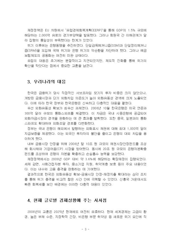 2008 ±Û·Î¹ú ±ÝÀ¶À§±â¿¡ ´ëÇÑ ¹Ì, EU, ¿ì¸®³ª¶óÀÇ ´ëÀÀÀ» ºñ±³Çϰí, ÇöÀç ±Û·Î¹ú °æÁ¦»óȲ¿¡ ÁÖ´Â ½Ã»çÁ¡À» Á¤¸®Çغ¸½Ã¿À.