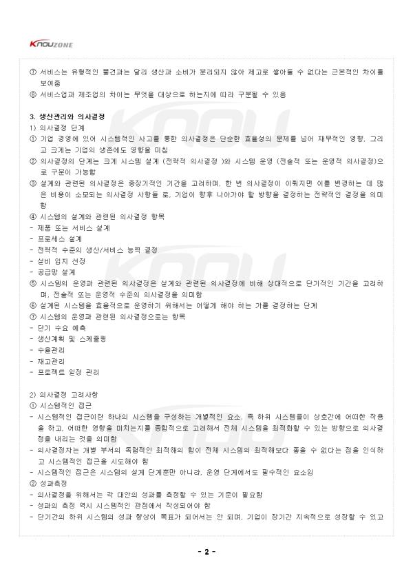 1. ±â¾÷ ¿î¿µ°ú »ý»ê°ü¸® 1) »ý»ê°ü¸® ¨ç ±â¾÷Àº °í°´ÀÌ ¿ä±¸ÇÏ´Â °¡Ä¡¸¦ Àü´ÞÇϱâ À§ÇÏ¿© Á¦Ç°À» »ý»êÇÏ¿© ÆÇ¸ÅÇϰí, ´Ù¾çÇÑ ¼ºñ½º¸¦ Á¦°øÇÔ ¨è À̸¦ À§ÇØ, ±â¾÷ ³»¿¡´Â ´Ù¾çÇÑ ±â´ÉµéÀÌ Á¸ÀçÇÏ¸ç ¼·Î À¯ ±âÀûÀ¸·Î ¿¬°èµÇ¾î ÀÖÀ½ ¨é ÀϹÝÀûÀ¸·Î ±â¾÷ÀÇ ³»ºÎ ±â´ÉÀº À繫, ¸¶ÄÉÆÃ, »ý»ê ¹× ¿î¿µÀÇ 3°¡Áö·Î ±¸ºÐµÉ ¼ö ÀÖÀ½ ¨ê Á¦Á¶¾÷ÀÌµç ¶Ç´Â ¼ºñ½º¾÷ÀÌµç ¸ðµç ÇüÅÂÀÇ Á¶Á÷¿¡´Â ÀÌ¿Í °°Àº ¼¼ °¡Áö ±â´ÉÀÌ Á¸ÀçÇÔ ¨ë À繫 ±â´ÉÀº ±â¾÷ÀÇ Àç¿øÀ» °èȹ, Á¶´Þ, ¹èºÐ, °ü¸®Çϸç È¿°úÀûÀÎ ÅõÀÚ¸¦ ÅëÇÏ¿© »ç¾÷À» ¼ºÀå½ÃŰ´Â Ȱµ¿µéÀ» Æ÷ÇÔÇÔ ¨ì ¸¶ÄÉÆÃ ±â´ÉÀº °í°´ÀÌ ÇÊ¿ä·Î Çϰųª ¿øÇÏ´Â »çÇ×À» ÆÄ¾ÇÇϰí, Á¦Ç°°ú ¼ºñ½º¸¦ °í°´¿¡°Ô È¿°úÀûÀ¸·Î Àü´ÞÇϱâ À§ÇØ ÀÏ·ÃÀÇ ¹æ¹ý (°¡°Ý ÇÁ·Î¸ð¼Ç µî)µéÀ» Á¦°øÇÔ ¨í ¸¶Áö¸·À¸·Î »ý»ê ¹× ¿î¿µ ±â´ÉÀº ±â¾÷ÀÌ °í°´¿¡°Ô Àü´ÞÇÏ·Á´Â Á¦Ç°À» »ý»êÇÏ°í ¼ºñ½º¸¦ Á¦°øÇÏ´Â ¿ªÇÒÀ» ´ã´çÇÔ ¨î ÀÌ¿ÜÀÇ ±âŸ ±â´ÉÀ¸·Î´Â ±¸¸Å, Àλç, ¿¬±¸°³¹ß µîÀÌ ÀÖÀ½ ¨ï »ý»ê ¹× ¿î¿µ¿¡ ÇÊ¿äÇÑ ÅõÀÔ¹°¿¡´Â ´Ù¾çÇÑ ¿ä¼ÒµéÀÌ Á¸ÀçÇÔ ¨ð ½Ã¼³À» À§Ä¡½Ã۱â À§ÇÑ ¿ëÁö¿Í °Ç¹°. »ý»ê°ú ¼ºñ½º¸¦ ´ã´çÇϰí À̸¦ °ü¸®Çϱâ À§ÇÑ ÀÎÀû ÀÚ¿ø°ú ¹°Àû ÀÚ¿ø(±â°è, ÄÄÇ»ÅÍ. ¿î¼Û µµ±¸ µî), ¿øÀÚÀç ¹× ¿¡³ÊÁö. ±â¾÷ÀÌ ¿î¿µÇÒ ¼ö ÀÖ´Â ÀÚº» µîÀº ÅõÀÔ¹°ÀÇ ¿¹ÀÓ ¨ñ ÅõÀÔ¹°Àº °¡°ø, Æ÷Àå, ¿î¼Û, ÀúÀå µîÀÇ ´Ù¾çÇÑ ÇüÅÂÀÇ Ã³¸® °úÁ¤À» ÅëÇØ »êÃâ¹°·Î ÀüȯµÊ ¨ò Áø·á, »ó´ã, °ÀÇ¿Í °°Àº ¼ºñ½º ÇüÅÂÀÇ Ã³¸® °úÁ¤ ¿ª½Ã ÅõÀÔ¹°¿¡ °¡Ä¡¸¦ ´õÇÏ¿© »êÃâ¹°À» ¸¸µå´Â Ȱµ¿À¸·Î ¼³¸íµÉ ¼ö ÀÖÀ½ ¨ó ÀÌ¿Í °°ÀÌ ÇϳªÀÇ ¶Ç´Â Çϳª ÀÌ»óÀÇ ÅõÀÔ¹°À» °í°´¿¡°Ô Àü´ÞÇÏ´Â »êÃâ¹°·Î ÀüȯÇϴ Ȱµ¿Àº ÇÁ·Î¼¼½º·Î Á¤ÀÇµÊ ¨ô °ü·ÃµÈ °³º°ÀûÀÎ ÇÁ·Î¼¼½ºµéÀÌ ¸ð¿© ÀÌ·ç¾îÁø ÇϳªÀÇ ÃÑüÀûÀΠü°è¸¦ ½Ã½ºÅÛÀ̶ó Á¤ÀÇµÉ ¼ö ÀÖÀ½