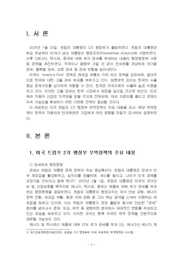2025³â 1¿ù 20ÀÏ, Æ®·³ÇÁ ´ëÅë·ÉÀÇ 2±â ÇàÁ¤ºÎ°¡ Ãâ¹üÇÏ¿´´Ù. Æ®·³ÇÁ ´ëÅë·ÉÀº ÃëÀÓ Ã¹³¯ºÎÅÍ 40°³°¡ ³Ñ´Â ´ëÅë·ÉÀÇ ÇàÁ¤Á¶Ä¡(Presidential Actions)¿¡ ¼¸íÇÏ¿´´Ù. ÀÌÈÄ 2ij³ª´Ù, ¸ß½ÃÄÚ, Áß±¹¿¡ ´ëÇØ Ãß°¡ °ü¼¼¸¦ ºÎ°úÇÏ´Â ³»¿ëÀÇ ÇàÁ¤¸í·É¿¡ ¼¸í µî Á¤Ã¥À» ÃßÁøÇÏ¿´´Ù. Àû±¹À̳ª µ¿¸Í±¹ °¡¸± °Í ¾øÀÌ Àü¼¼°è¸¦ °Ü³ÉÇÏ¿© ±¹°¡º° °ü¼¼, ǰ¸ñº° °ü¼¼, »óÈ£ °ü¼¼ µî °ü¼¼ À§ÇùÀ» ½ñ¾Æ³»¾ú´Ù. ¹Ì±¹ÀÇ 'America First' Á¤Ã¥Àº Á¦Á¶¾÷ ºÎÈï°ú ÀÚ±¹ ¿ì¼± Á¤Ã¥À» °Á¶Çϸç, °á°úÀûÀ¸·Î Çѱ¹¿¡ ´ëÇÑ °íÀ² °ü¼¼ ºÎ°ú¸¦ ºÎÃß±â°í ÀÖ´Ù. º¸È£¹«¿ª Á¶Ä¡´Â Çѱ¹ÀÇ ¼öÃâ Á᫐ °æÁ¦±¸Á¶¸¦ ½É°¢ÇÏ°Ô À§ÇùÇÒ ¼ö ÀÖ´Ù. Çѱ¹Àº ¹Ì±¹À¸·ÎÀÇ ¼öÃâ¿¡ ³ôÀº ºñÁßÀ» µÎ°í ÀÖ´Ù. ÀÌ·¯ÇÑ °íÀ² °ü¼¼´Â Çѱ¹ ½ÃÀå¿¡¼ ÆÄÀåÀ» ÀÏÀ¸Å³ °ÍÀ¸·Î º¸ÀδÙ. ¹ÝµµÃ¼¿Í ÀÚµ¿Â÷ »ê¾÷Àº Á÷°ÝźÀ» ¸ÂÀ» °ÍÀ¸·Î Àü¸ÁµÇ¸ç, ´ë¿Ü ÀÇÁ¸µµ¸¦ ÁÙÀÌ°í °æÁ¦ÀÇ Áö¼Ó °¡´É¼ºÀ» È®º¸Çϱâ À§ÇÑ ´Ùº¯È Àü·«ÀÌ ÇÊ¿äÇÒ °ÍÀÌ´Ù. ÀÌ ·¹Æ÷Æ®´Â ¹Ì±¹ Æ®·³ÇÁ 2±â ÇàÁ¤ºÎ ¹«¿ªÁ¤Ã¥ÀÇ ÁÖ¿ä ³»¿ëÀ» Á¶»ç, ÇØ´ç ¹«¿ªÁ¤Ã¥ÀÌ Çѱ¹ÀÇ ÀÚµ¿Â÷¿Í ¹ÝµµÃ¼°ü·Ã ±â¾÷¿¡°Ô ¾î¶² ¿µÇâÀ» ¹ÌÄ¥Áö Á¶»çÇÏ¿© ¼³¸íÇÏ¿´´Ù.