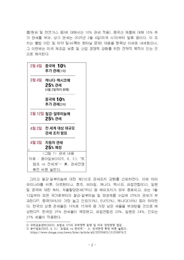 1) °ü¼¼ºÎ°ú ÇàÁ¤¸í·É °ü¼¼´Â Æ®·³ÇÁ ´ëÅë·É °æÁ¦ Á¤Ã¥ÀÇ ÁÖ¿ä Áß½ÉÃàÀÌ´Ù. Æ®·³ÇÁ ´ëÅë·ÉÀº °ü¼¼°¡ ¹Ì±¹ Á¦Á¶¾÷À» Ȱ¼ºÈÇϰí, ÀÏÀÚ¸®¸¦ âÃâÇϸç, ¼¼¼ö¸¦ ´Ã¸®°í, ³ª¾Æ°¡ ¹Ì±¹ °æÁ¦¸¦ ¼ºÀå½Ãų °ÍÀ̶ó°í ¸»ÇØ ¿Ô´Ù. 2025³â 2¿ù 1ÀÏ, Æ®·³ÇÁ ´ëÅë·ÉÀº ¹Ì±¹ÀÇ ±¹°¡¾Èº¸ ¹× »ê¾÷º¸È£¸¦ ¸ñÀûÀ¸·Î ij³ª´Ù, ¸ß½ÃÄÚ, Áß±¹»ê Á¦Ç°¿¡ ´ëÇØ Ãß°¡ °ü¼¼¸¦ ºÎ°úÇÏ´Â ÇàÁ¤¸í·ÉÀ» °øÇ¥ÇÏ¿´´Ù. Æ®·³ÇÁ ´ëÅë·ÉÀÇ ÇàÁ¤Á¶Ä¡´Â ±¹°¡ ¾Èº¸ °È, ¿¡³ÊÁö Á¤Ã¥ Àüȯ, Á¦Á¶¾÷ ºÎȰ, ȯ°æ ±ÔÁ¦ ¿ÏÈ µî ±×ÀÇ ÇÙ½É °ø¾àÀ» ½Å¼ÓÈ÷ ÀÌÇàÇÏ´Â µ¥ ÃÊÁ¡À» ¸ÂÃß°í ÀÖÀ¸¸ç, ÀÌ´Â Æ®·³ÇÁ ´ëÅë·ÉÀÌ Á¤±Ç Ãâ¹ü°ú µ¿½Ã¿¡ ´Ü¼øÇÑ ¡°°ü¼¼¡± ºÐ¾ß¸¦ ³Ñ¾î¼¼ °æÁ¦, ¿Ü±³, ¹«¿ª µî ±¤¹üÀ§ÇÑ ºÐ¾ß¿¡¼ ´ë´ëÀûÀÎ º¯È¸¦ ÁÖµµÇϰí ÀÖ´Â ¸ð½ÀÀ» º¸¿©ÁÖ°í ÀÖ´Ù. ÀÌ·¯ÇÑ Á¶Ä¡´Â ÇâÈÄ ¹Ì±¹ÀÇ ¹«¿ª Á¤Ã¥À» ±Ùº»ÀûÀ¸·Î ÀçÆíÇÒ °¡´É¼ºÀÌ Å©´Ù. ij³ª´Ù ¹× ¸ß½ÃÄÚ»ê Á¦Ç°¿¡ ´ëÇØ 25% Ãß°¡ °ü¼¼¸¦ ºÎ°ú (´Ü, ij³ª´Ù»ê ¿¡³ÊÁö Á¦Ç°(¿øÀ¯ ¹× õ¿¬°¡½º µî)¿¡ ´ëÇØ¼´Â 10% °ü¼¼ Àû¿ë), Áß±¹»ê Á¦Ç°¿¡ ´ëÇØ 10% Ãß°¡ °ü¼¼¸¦ ºÎ°ú, »ó±â °ü¼¼´Â 2025³â 2¿ù 4ÀÏ(¹Ì±¹ ½Ã°¢)ºÎÅÍ ¹ßÈ¿ µîÀÌ´Ù. ÀÌ Á¶Ä¡´Â ºÒ¹ý À̹Π¹× ¸¶¾à ¹Ð¼ö(ƯÈ÷ ÆæÅ¸´Ò ¹®Á¦) ´ëÀÀÀ» ¸í¸ñ»ó ÀÌÀ¯·Î ³»¼¼¿üÀ¸³ª, ±× À̸鿡´Â ¹Ì±¹ Á¦Á¶¾÷ º¸È£ ¹× »ê¾÷ °æÀï·Â °È¸¦ À§ÇÑ Àü·«Àû ¸ñÀûÀÌ ÀÖ´Â °ÍÀ¸·Î ÇØ¼®µÈ´Ù.
