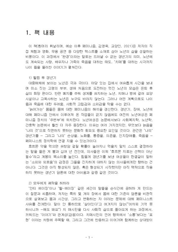 ÀÌ Ã¥(Èò¸Ó¸® ÈÖ³¯¸®¸ç, ¿¹¼ø ÀÌÈÄ Æä¹Ì´ÏÁò, ±è¿µ¿Á, ±³¾çÀÎ, 2021)Àº ÀúÀÚÀÇ Á÷Á¢ üÇè°ú ¿µÈ, ¹«¿ë °ø¿¬ µî ´Ù¾çÇÑ ÅØ½ºÆ®¸¦ ¼ÒÀç·Î »ï¾Æ ³ë³âÀÇ »îÀ» ¼ºÂûÇÏ´Â ºñÆòÀÌ´Ù. ÀÌ °úÁ¤¿¡¼ ¡®¿Ï°æ¡¯À̶ó´Â ¸»·Î´Â µå·¯³¾ ¼ö ¾ø´Â °»³â±âÀÇ ÀǹÌ, ³ë³â¿¡µµ °è¼ÓµÇ´Â »ç¶û, ¹è¿ìÀÚ³ª °¡Á·ÀÇ Á×À½À» ´ëÇϴ ŵµ, ¡®Ä¡¸Å¡¯¸¦ ´ëÇÏ´Â ½Ã°¢±îÁö ³ªÀÌ µêÀ» µÑ·¯½Ñ À̾߱Ⱑ ÆîÃÄÁø´Ù.