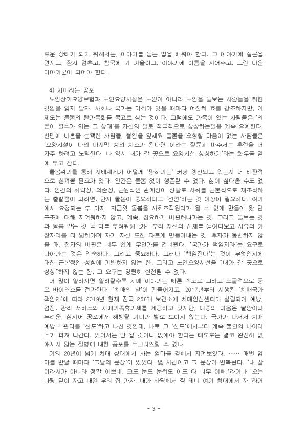 2) ¸ðµÎ¿¡°Ô Äè¶ôÀ» ÇãÇÏ¶ó ¡®¾ÈƼ ¿¡ÀÌ¡¡¯À̳ª ¡®À£-¿¡ÀÌ¡¡¯ °°Àº ¼¼°£ÀÇ ¸»µéÀ» ¼ø½Ä°£¿¡ °øÇãÇÏ °Ô ¸¸µå´Â ÀÌ Áú¹®°ú ¾¾¸§Çϸç, ÀúÀڴ ƯÈ÷ ¸î °³ÀÇ Àå¿¡¼ ¸ö¿¡ ´ëÇÑ ±âÁ¸ÀÇ ´ã·ÐÀ» ºñÆÇÀûÀ¸·Î »ìÆìº¸°í ¸ö°ú ½Ã°£¼º, ±×¸®°í º¯ÈÇÏ´Â ÀÚ ¾Æ¶ó´Â ¹®Á¦¿¡ ´ëÇØ Æä¹Ì´Ï½ºÆ® »çÀ¯¸¦ Àü°³ÇÑ´Ù. ¸»ÀÌ ¾È ÅëÇϹǷΠ¡®»ì¾ÆÀÖ´Ù¡¯°í ¿©°ÜÁöÁö ¾Ê´Â(¡°¾îÂ÷ÇÇ ±â¾ï ¸ø ÇϽôϱî ~ÇØµµ µÅ¿ä¡±) Ä¡ ¸Å½Ã¹ÎÀ» ´Ù½Ã »çȸÀû »îÀ¸·Î µ¹¾Æ¿À°Ô ÇÏ´Â °úÁ¤¿¡¼, Ű¿öµå´Â ¡®À̾߱⡯¿Í °ü°è¼º(°¨ÀÀ)ÀÌ´Ù. Ä¡¸Å½Ã¹ÎÀÇ ¾ð¾î ÇàÀ§¿¡¼ ¡®¼ÒÅ롯º¸´Ù´Â ¡®Ç¥Çö¡¯ À̶ó´Â Â÷¿ø¿¡ ÁÖ¸ñÇÒ ¶§, ±×¸®°í ±×°Í¿¡ ¹ÝÀÀÇϰí À̾¸ç ÇÔ²²ÇÏ´Â »ó´ë¹æÀÌ ÀÖÀ» ¶§, ¡°±â½ÂÀü°áµµ Àϰü¼ºµµ ¾ø¡±Áö¸¸ ¡°±×·¯³ª ÇÑ ÆíÀÇ ÅØ½ºÆ®°¡ Â¥¡±ÀÏ ¼ö ÀÖ´Ù´Â °ÍÀÌ´Ù. ÀúÀÚ°¡ °Á¶ÇÏ´Â ¡®À̾߱⡯´Â ´Ü Áö ³ú ±â´É¿¡ ±¹ÇÑµÈ ¿ª·®ÀÌ ¾Æ´Ï¶ó, ÀλýÀ» »ì¾Æ ³½ ¸ö¿¡ ¾çÇÇÁöó·³ ¾²¿©Á® ÀÖ´Â °ÍÀ̱⵵ ÇÏ´Ù. µ¥À̵巹 Çǽ© °¨µ¶ÀÌ ¸¸µç ´ÙÅ¥¸àÅ͸® <¿©ÀüÈ÷ »ç¶ûÇϰí ÀÖ½À´Ï´Ù>´Â ÅëÄèÇϰÔ, ¡®³ë°ñÀû¡¯À¸·Î, ´ÄÀº ¿©¼ºµéÀÇ ¼ºÀû ¿å¸ÁÀ» µå·¯³½´Ù. ¿µÈ¿¡ µîÀåÇÏ´Â ¾ÆÈ© ¸íÀÇ ¿©ÀÚµéÀº ¸ðµÎ 65¼¼ ÀÌ»óÀÇ ¡®´ÄÀº ¿©ÀÚ ³»Áö´Â ÇҸӴϵ顯ÀÌ´Ù. ±×·¯³ª 50¿© ºÐ µ¿¾È À̵éÀÌ ¼ÖÁ÷Çϰí ÄèȰÇÏ°Ô µé·ÁÁÖ´Â ¼ºÀû ¿å¸Á°ú »ç¶ûÇϱâÀÇ Áñ°Å¿òÀ» µû¶ó°¡´Ù º¸¸é À̵éÀ» ƯÁ¤ ´ë¸í»ç·Î ºÎ¸£´Â °ÍÀÌ °ú¿¬ ÀûÇÕÇÑÁö ¹¯Áö ¾ÊÀ» ¼ö ¾ø´Ù. ½ÇÁ¦·Î µîÀåÀι°µé Áß¿¡´Â ¿Í´ÏŸó·³ ÇÒ¸Ó´ÏÀÌ¸é¼ µ¿½Ã¿¡ ÁõÁ¶ÇÒ¸Ó´ÏÀÎ ¿©¼ºµµ ÀÖ´Ù. ±×·¯´Ï±î À̵鿡°Ô ¡®ÇÒ¸Ó´Ï¡¯¶ó´Â ´Ü¾î´Â ´Ü¼øÈ÷ Ä£Á· ¾È¿¡¼ÀÇ °ü°è¸¦ ³ªÅ¸³»´Â ±âÇ¥ÀÏ »ÓÀÌ´Ù. ¾Æµé µþ ¸ç´À¸® ¼ÕÁֵ鿡 µÑ·¯½Î¿© ¡®¼Ò³à󷳡¯ ¼øÁøÇϰí ÇູÇÑ ¹Ì¼Ò¸¦ ¶ì°í »ýÀÏ ÄÉÀÌÅ©ÀÇ ÃкÒÀ» ²ô´Â, ´õ´Â ¼½½ÃÇÑ ¶õÁ¦¸®¸¦ ÀÔÀ» Çʿ䰡 ¾ø´Â, ¾Æ´Ï ¾Æ¿¹ ±×·± ¿å±¸¸¦ ¾ð±ÞÇÏ´Â °Í ÀÚü°¡ âÇÇÇÏ°í ºÒ°æ½º·´°Ô ¿©°ÜÁö´Â ¡®ÇÒ¸Ó´Ï.¡¯ ÀÌ·¸°Ô »çȸ¹®ÈÀûÀ¸·Î ¡®ÇÒ¸Ó´Ï¡¯¿¡ ´Þ¶óºÙÀº °¡Á· Áß½ÉÀûÀÎ Àǹ̴ Æò»ýÀ» Àç±â¹ß¶öÇÏ°Ô Àڱ⠸ڴë·Î »ì¾Æ¿Â ½Ì±Û ¿©¼º¿¡°Ôµµ ¿¹¿Ü ¾øÀÌ Àû¿ëµÈ´Ù. °¡ºÎÀåÁ¦ »çȸ¿¡¼ ¿©ÀÚ¶ó¸é ÀÏÁ¤ ¿¬·É´ë¿¡ ´©±¸³ª ¡®¾ÆÁܸ¶¡¯°¡ µÇµíÀÌ ±×·¸°Ô ÀÏÁ¤ ¿¬·É´ë°¡ µÇ¸é ¶Ç ´©±¸³ª ÇҸӴϰ¡ µÈ´Ù.